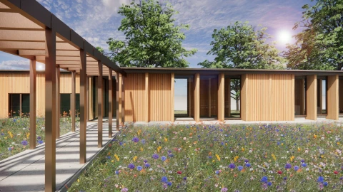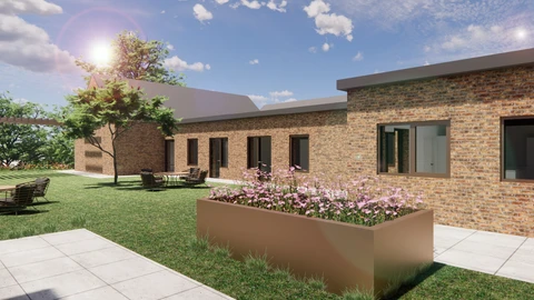 Hovedindgangen til plejecentret markeres af en smuk pergola, der naturligt fører besøgende til plejecentrets ankomstområde.